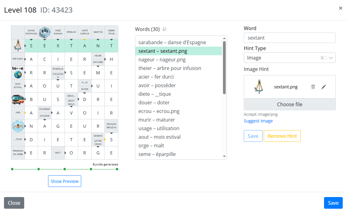 Ensure the grid respects industry requirements and conformities: 9x7 grid, inner hint cells well spaced, between 4 and 6 images hints, rebus hints...