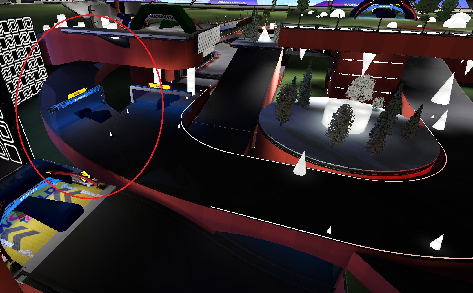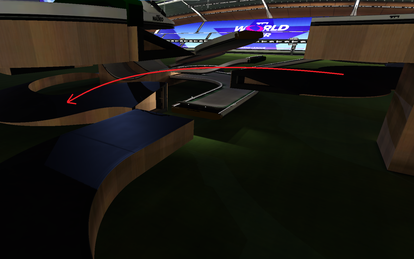 The problem with that idea is we don't have any solution to get the checkpoint on the upper platform as we skipping the left road. But if a reproductible bounce or jump leads the car to the top paltform, it might be a huge shortcut if we take the same path as others known shortcuts.